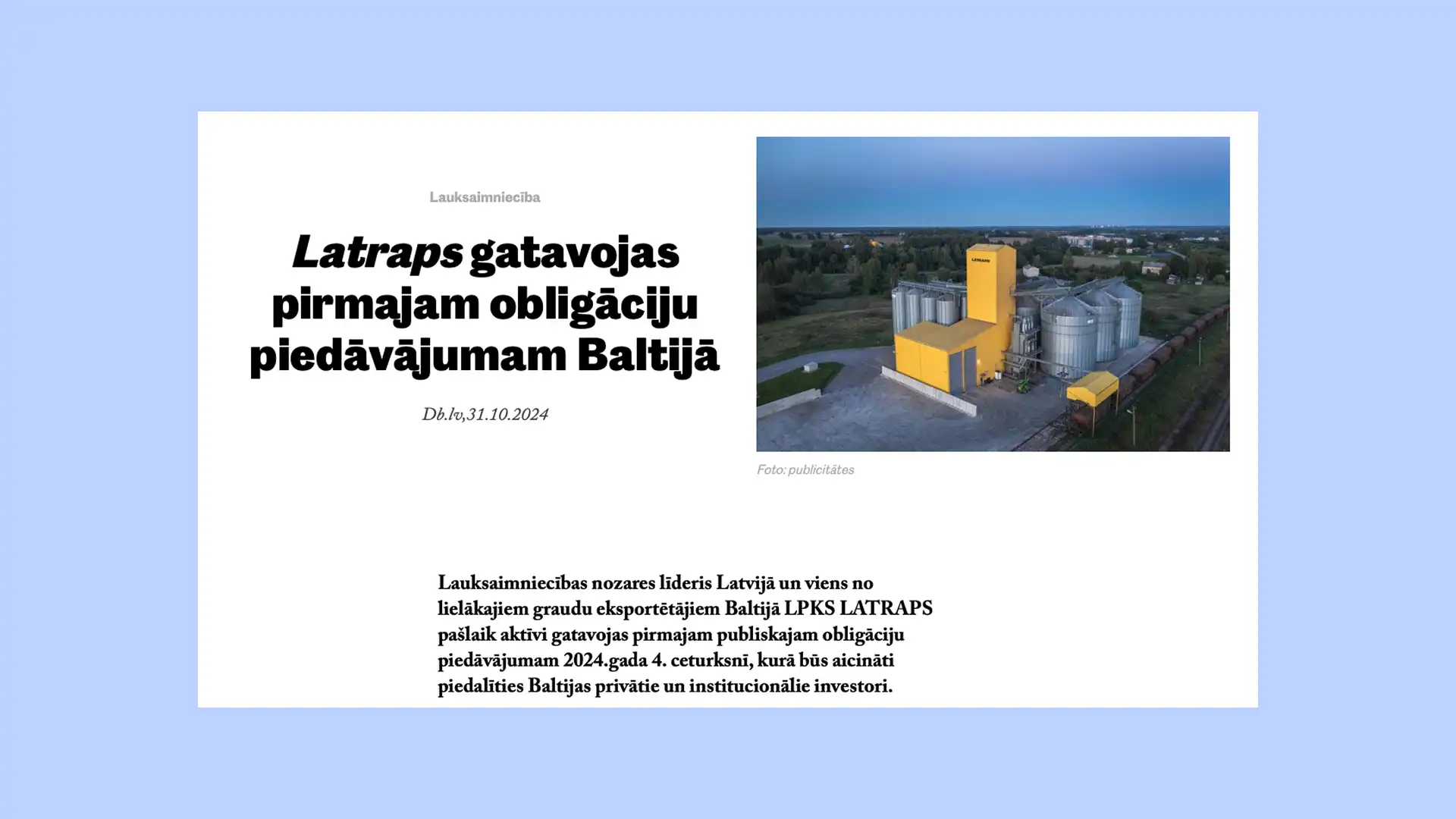 Saskaņots stratēģiju, taktikas un pasākumu kopums, lai veiksmīgi realizētu lauksaimniecības līdera publisko obligāciju piedāvājumu Baltijā.